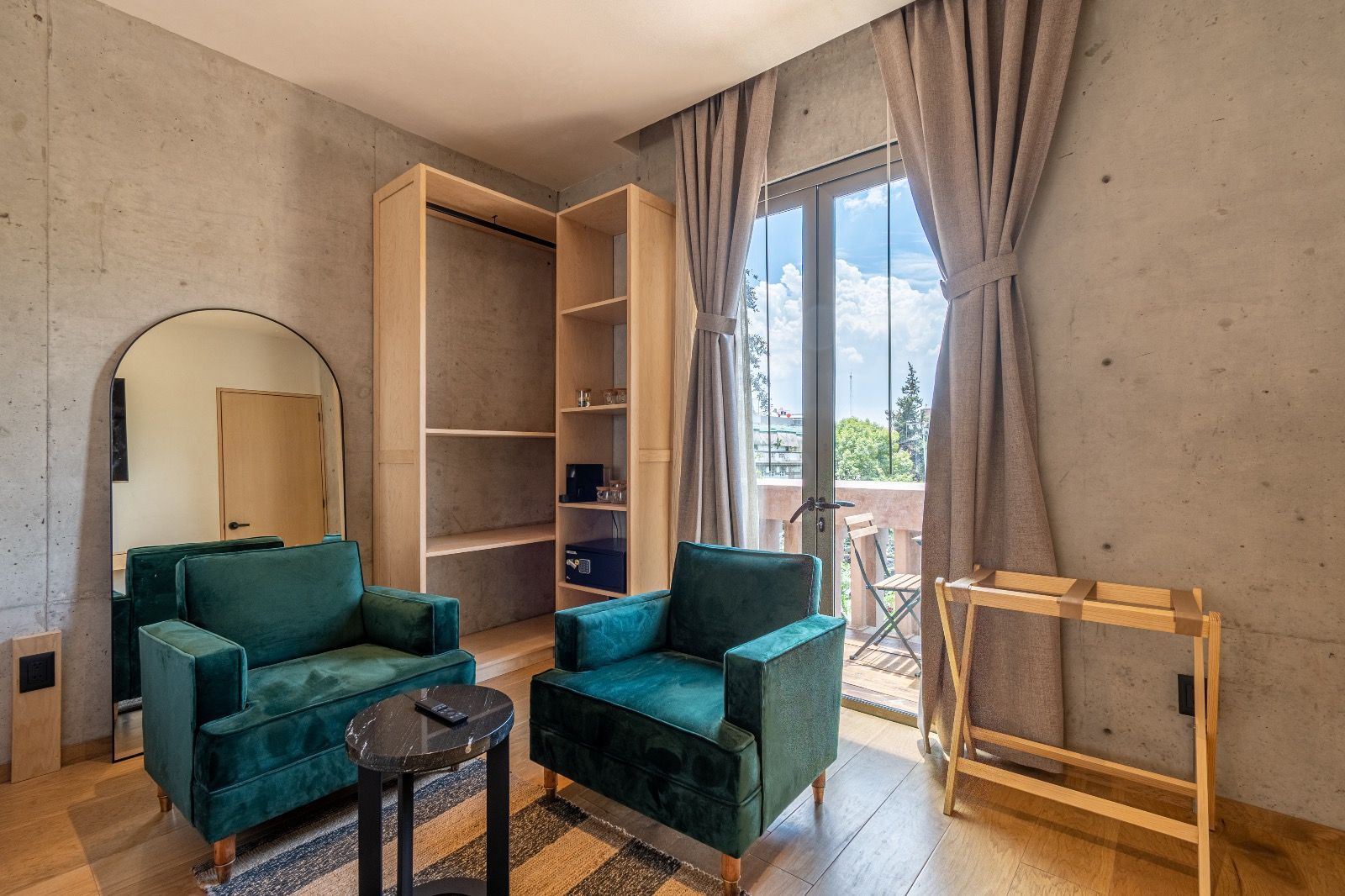 Spacious suite with king-size bed, private full bathroom, double-glazed windows, high-quality blackout curtains, 55-inch smart TV with 80 channels and streaming applications, internet with direct router in the room for a full Wi-Fi signal and possibility of connection via ethernet with 100 MB speed, Nespresso coffee machine, balcony with seating area, working desk and closet with safe, AC.